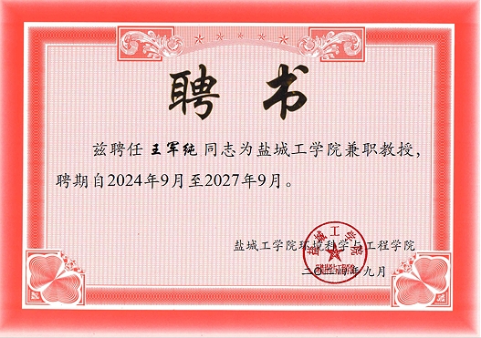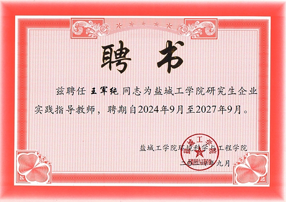 王軍純被聘為鹽城工學院環(huán)境學院兼職教授及研究生企業(yè)實踐指導教師