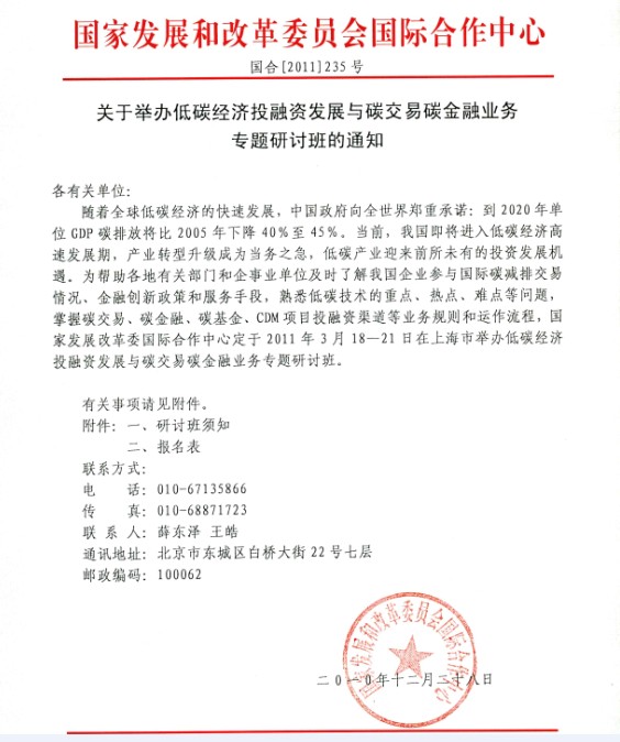 經(jīng)國家發(fā)改委國際合作中心授權(quán),現(xiàn)將國合【2011】235號文件關(guān)于2011年3月18日—21日在上海市舉辦“低碳經(jīng)濟投融資發(fā)展與碳交易碳金融業(yè)務專題研討班”通知轉(zhuǎn)發(fā)如下, 屆時將邀請國家發(fā)改委能源所、國務院發(fā)展研究中心、清華大學、財政部清潔發(fā)展機制基金管理中習等有關(guān)單位領(lǐng)導專家,現(xiàn)場授課交流,歡迎各會員單位報名參加。具體可與本站聯(lián)系方式中明確的郵件及電話聯(lián)系,也可直接與附件中會務組聯(lián)系。